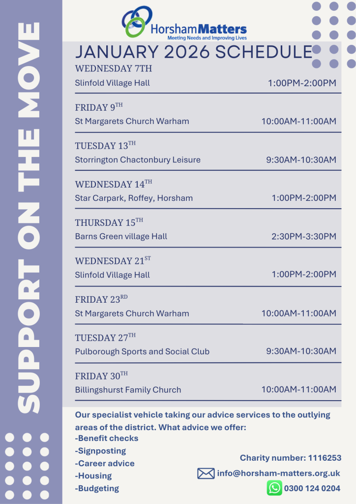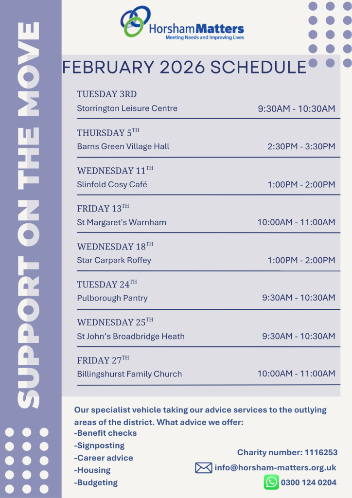In 2024, we launched our Support on the Move advice vehicle to support residents across Horsham District to access face to face support on issues such as housing, utilities, budgeting, benefits and debt. It travels to surrounding villages on a fortnightly schedule.