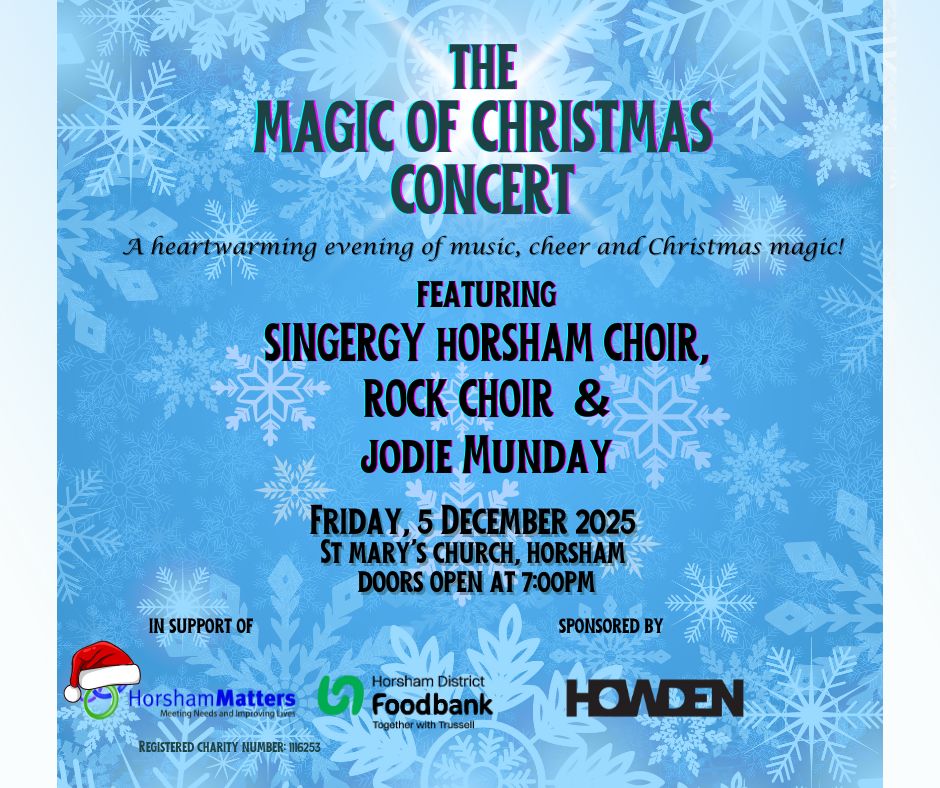 We’re thrilled to announce our Magic of Christmas Concert, proudly sponsored by Howden! Join us for a joyful evening of festive music and community spirit on Friday 5 December at St Mary’s Church, Horsham.