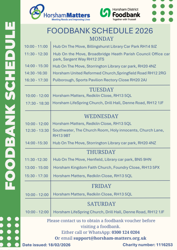 Please bring your food donations to our donation centre at Horsham Matters Community Support Centre, 1 Redkiln Close, RH13 5QL between 9.30am and 2pm.